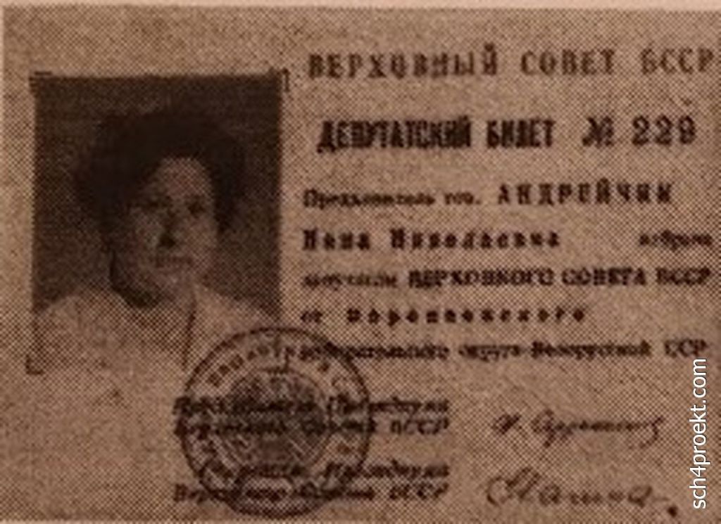 Передовая доярка колхоза «Заря», бабушка была выбрана депутатом Верховного Совета БССР 9 созыва от Поставского района по Воропаевскому избирательному округу. Никогда бабуля не «козыряла» своим депутатством и даже от повышенной пенсии отказалась — «А, что люди скажут?» Хотя сколько её помню, людям она делала только добро, помогала, где могла, и когда-то освоив шитьё, занималась любимым делом, шила наряды всей деревне. За работу денег не брала.